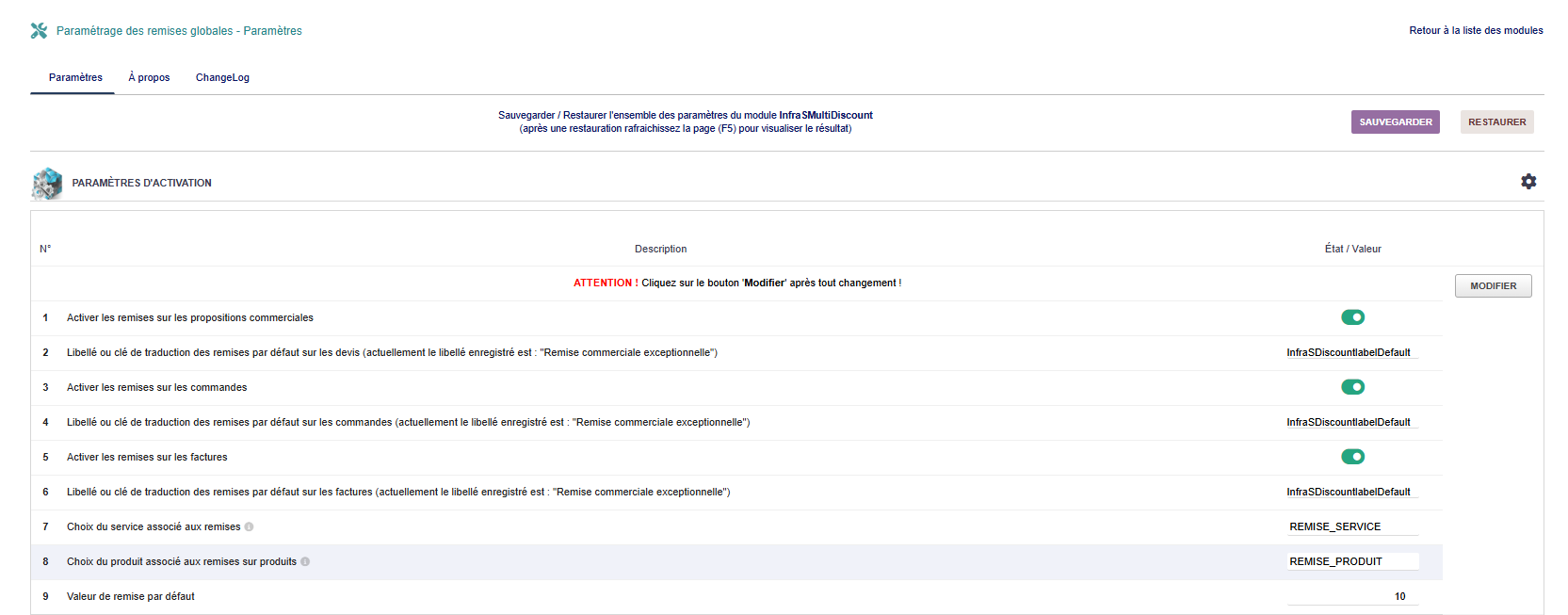 Menu Outils > InfraS > InfraSDiscount > Paramètres