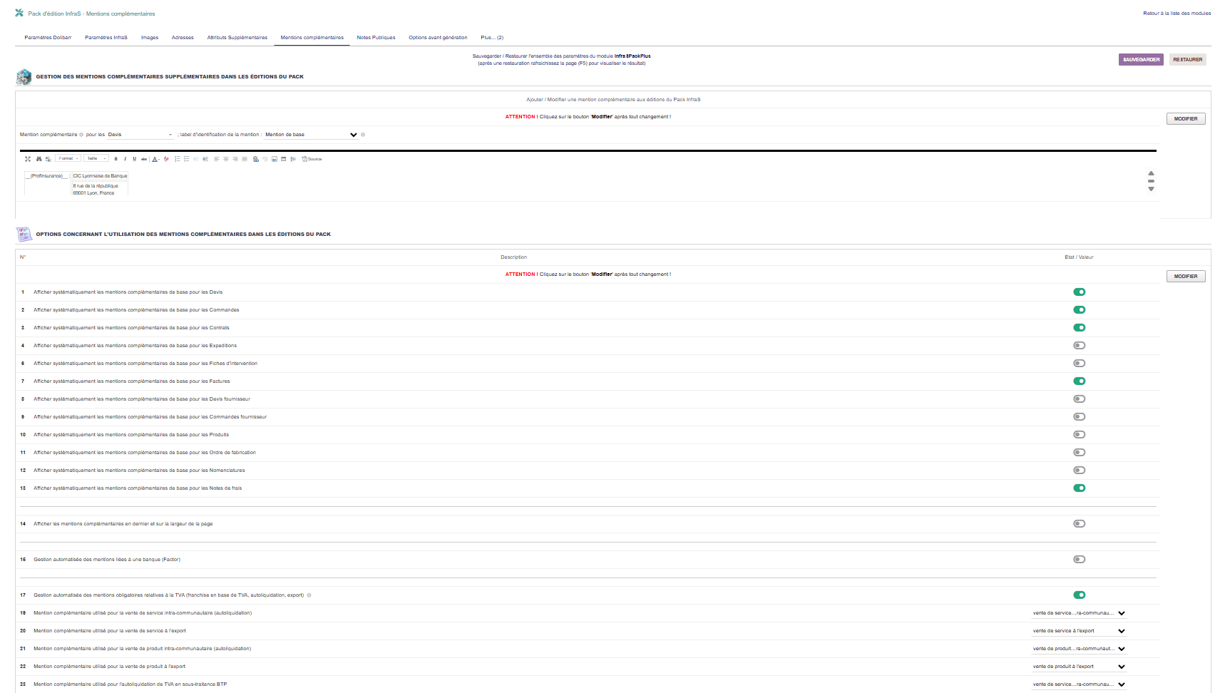 Les mentions complémentaires permettent d'ajouter des textes standardisés personnalisables sur vos documents (mentions légales, conditions particulières, clauses spécifiques, etc.).