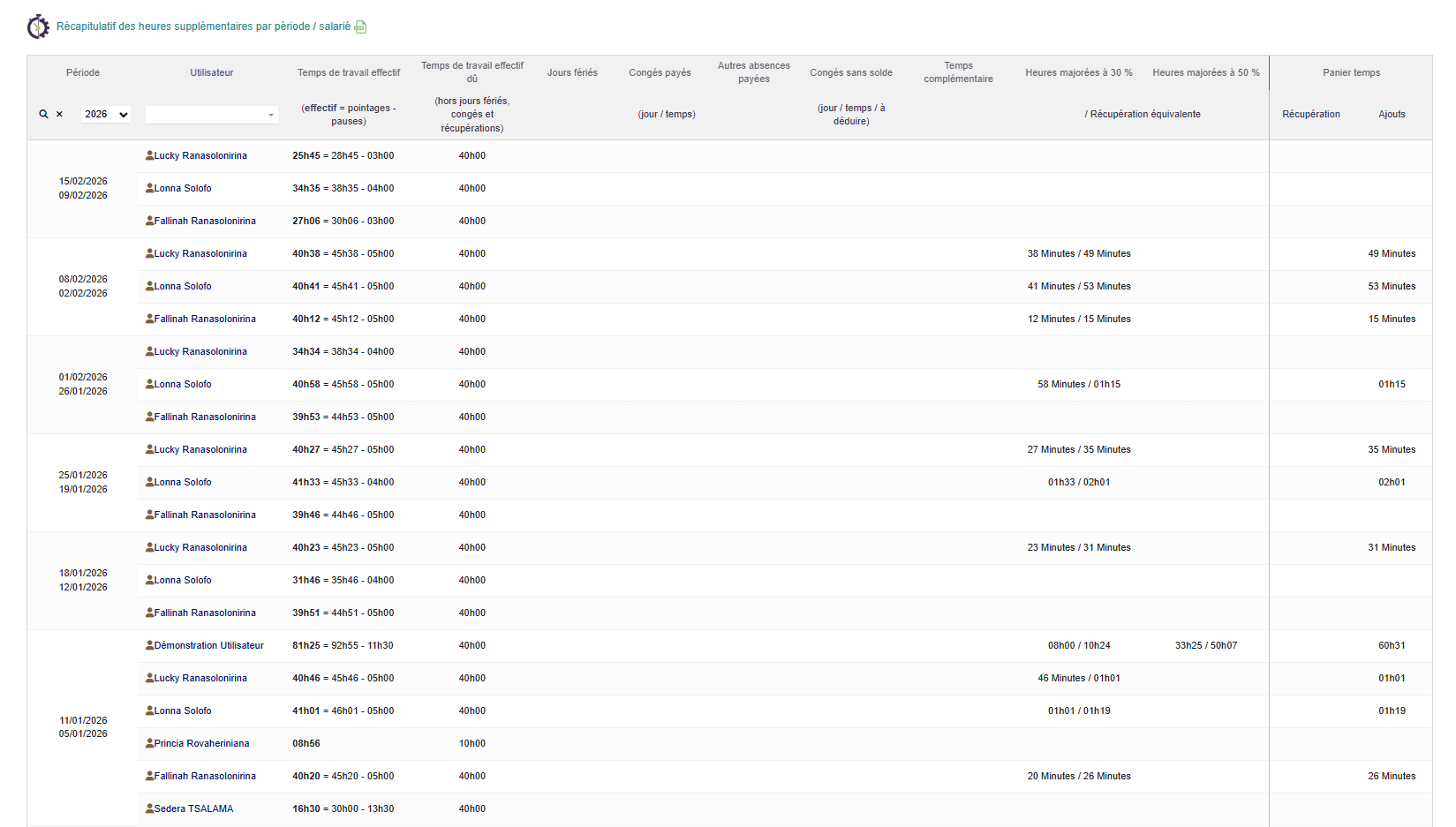 Le récapitulatif présente, pour chaque période et chaque salarié :