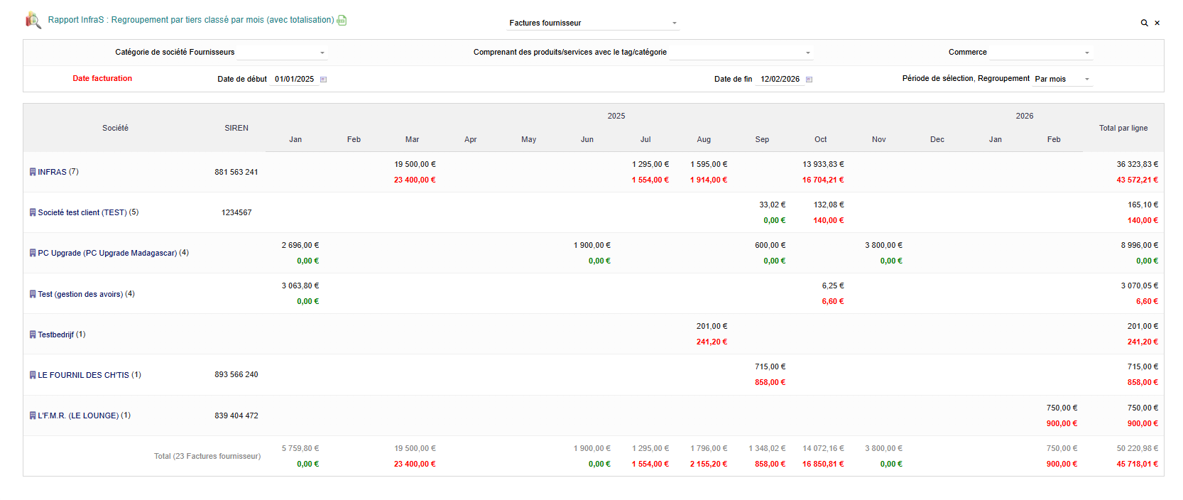 Projets → InfraSReports → Regroupement par tiers - Sélectionner : "Factures Fournisseurs"