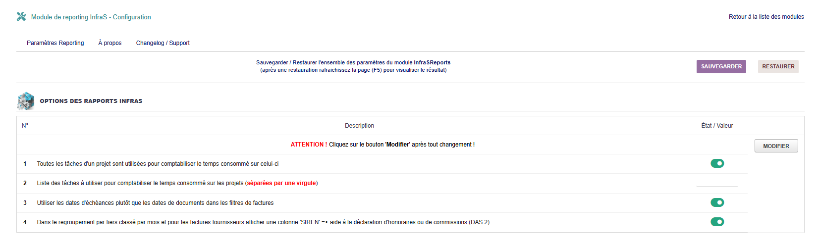 IMPORTANT : Cliquez sur le bouton 'Modifier' après tout changement pour enregistrer !