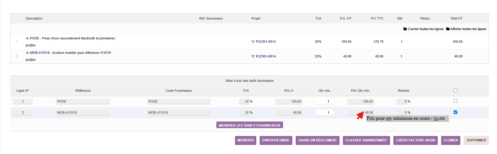 Lorsque vous consultez un document fournisseur (demande de prix, commande ou facture), le module ajoute un tableau de mise à jour des tarifs fournisseurs.